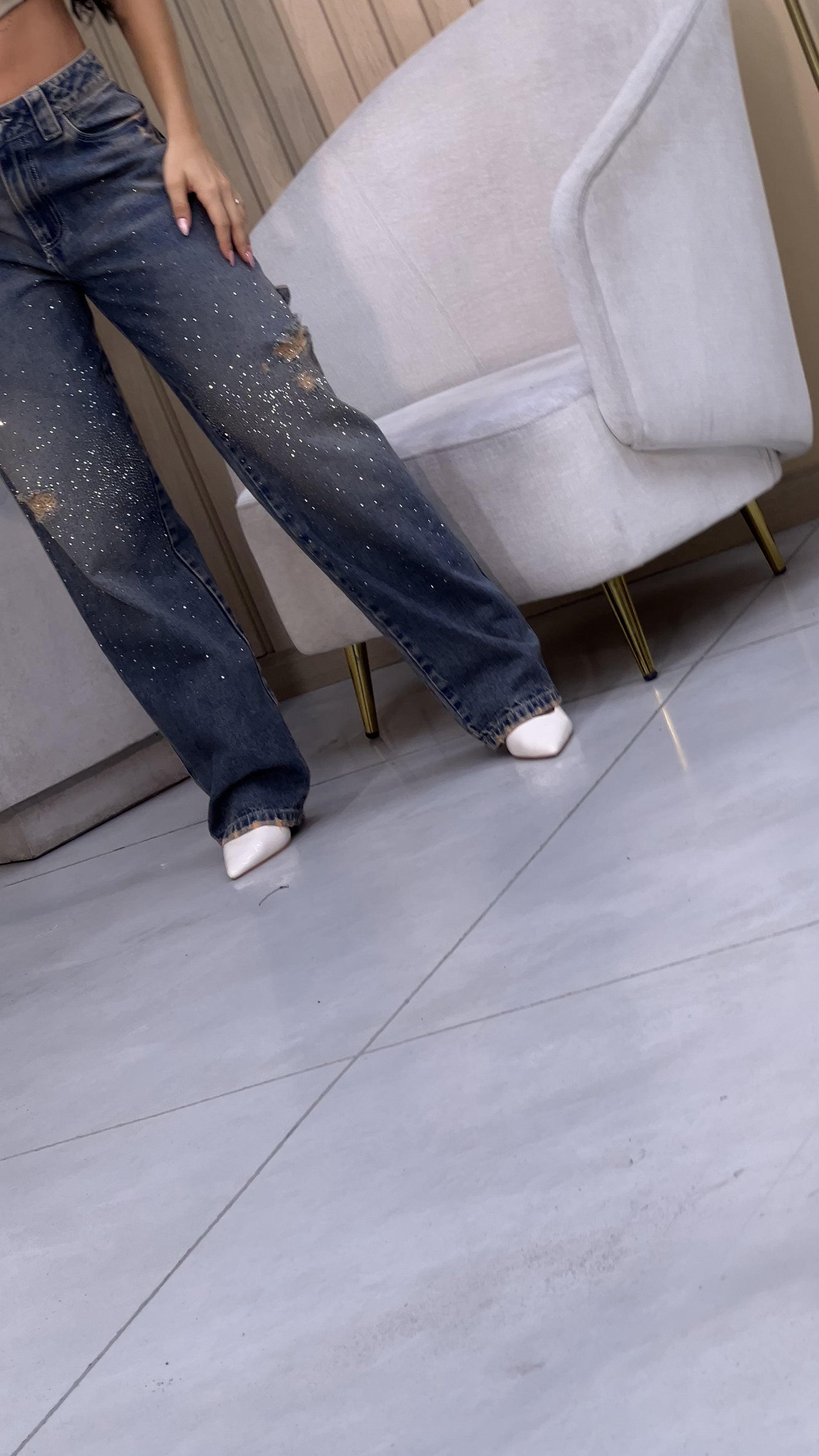 Aplicaciones de brillos en frente y laterales que iluminan el denim.